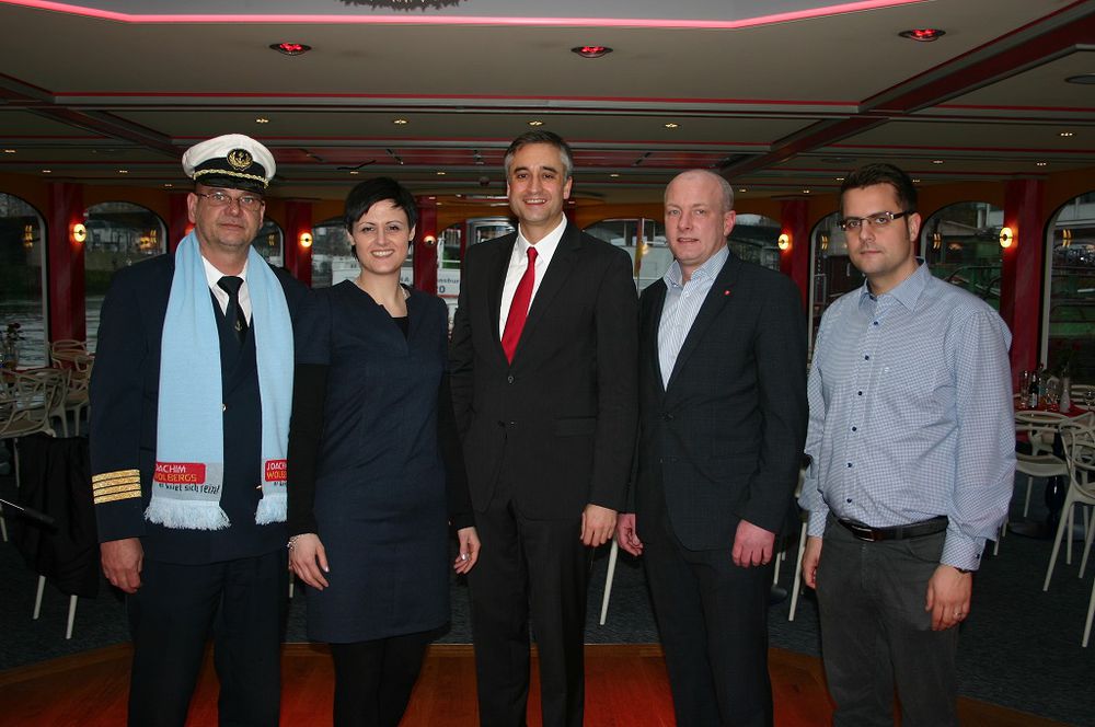 Joachim Wolbergs (2.v.r.) mit Mitglieder des SPD-Ortsvereins und dem Kapitän der MS Gloria.